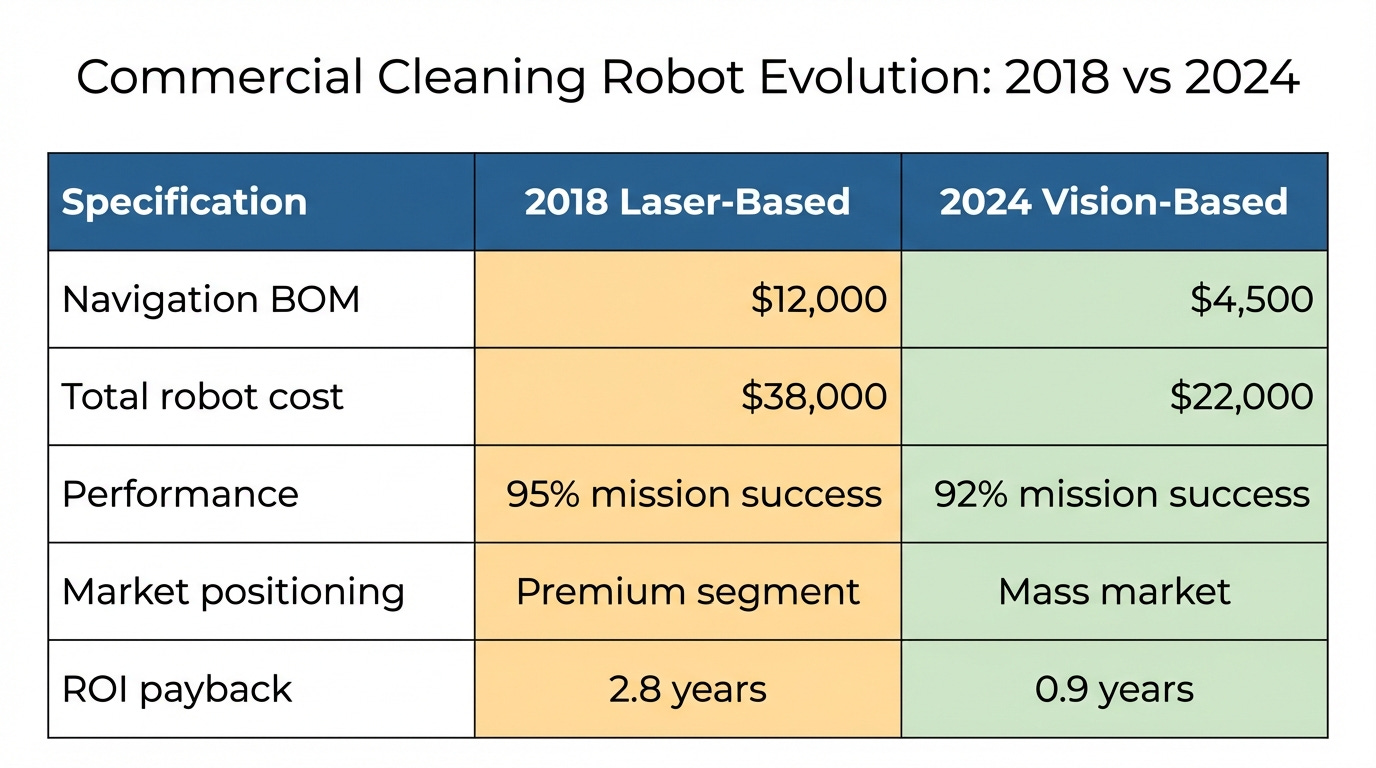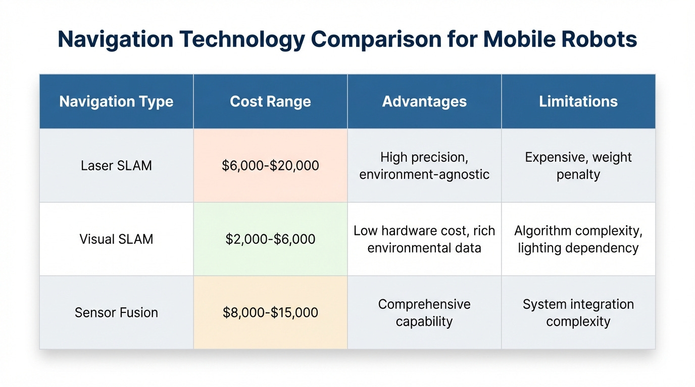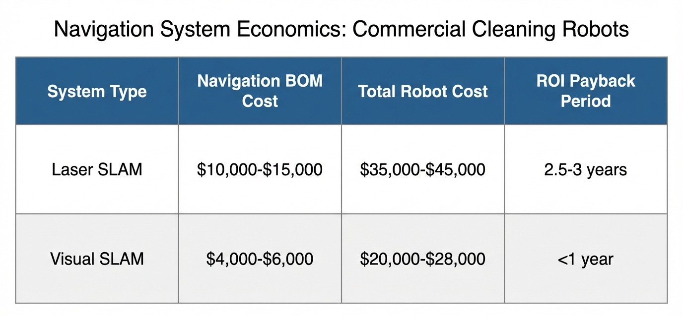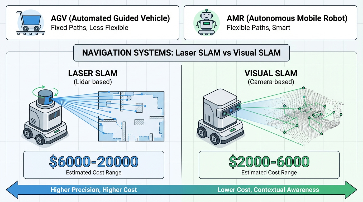 Figure 2: Comparative analysis of laser SLAM vs visual SLAM navigation systems showing the dramatic cost differential