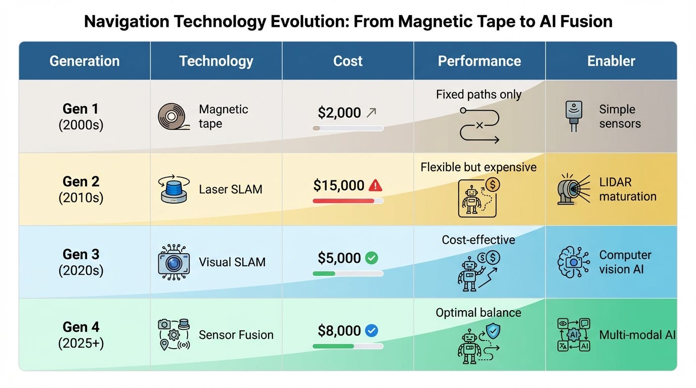 Navigation systems represent 40% of mobile robot costs, creating a critical optimization opportunity.