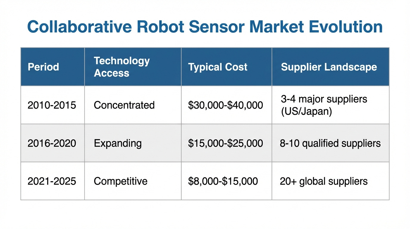 Force/torque sensing represents a significant cost driver in collaborative robotics. The market has evolved from a concentrated oligopoly to a competitive global ecosystem.